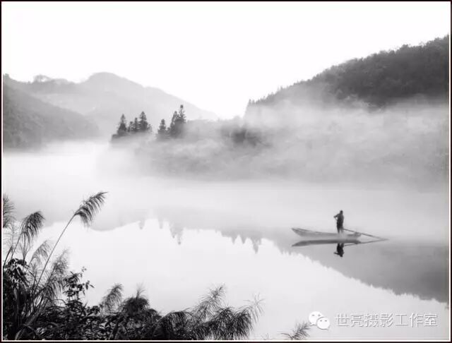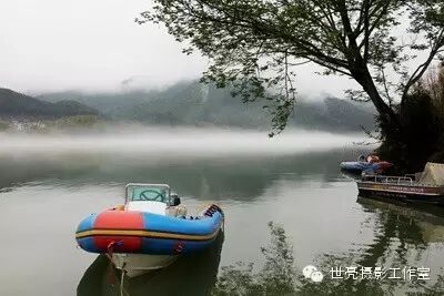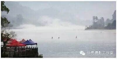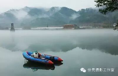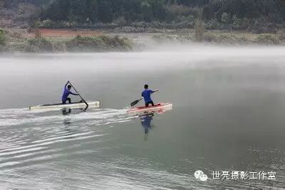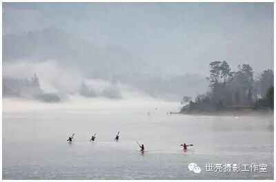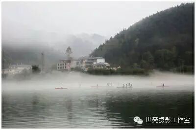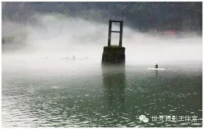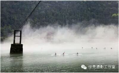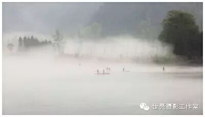 往上游望去,烟波浩渺,皮艇穿棱雾中如入仙境。